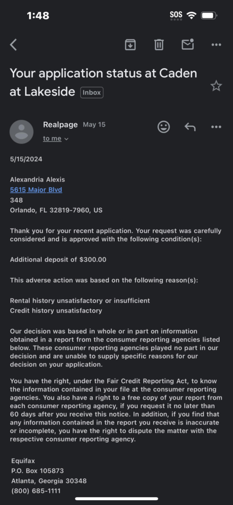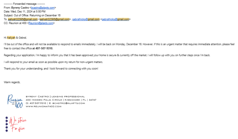 “Hey samanta this is Gabrielle Hart i did receive your email and i applied for 6101 W 25 st i already moved 3 weeks ago.